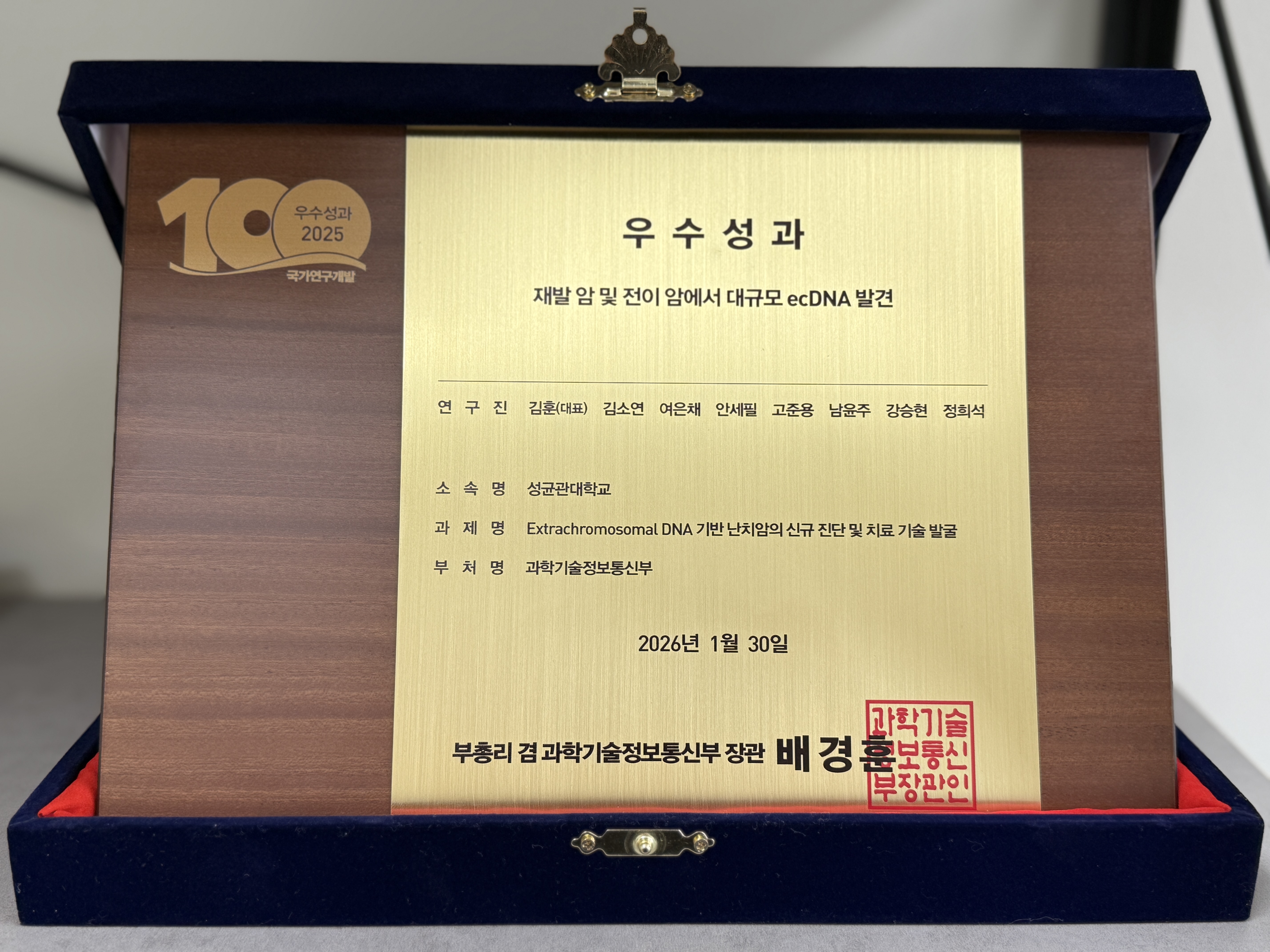 Our lab work, 재발 암 및 전이 암에서 대규모 ecDNA 발견, has been honored with 2025년도 국가연구개발 우수성과 100선 (상위 0.1% 수준의 핵심 과학기술 성과) !