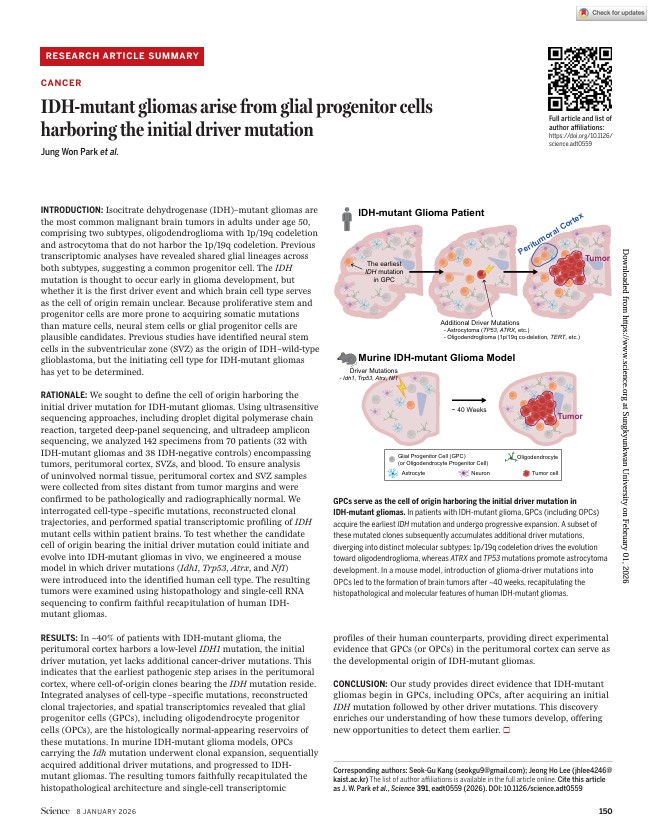 This study identified glial progenitor cells (GPCs) as the cell of origin in IDH-mutant gliomas, providing crucial insights into how these tumors first develop from the initial driver mutation. We thank all our lab members and collaborators for their dedication to this achievement.